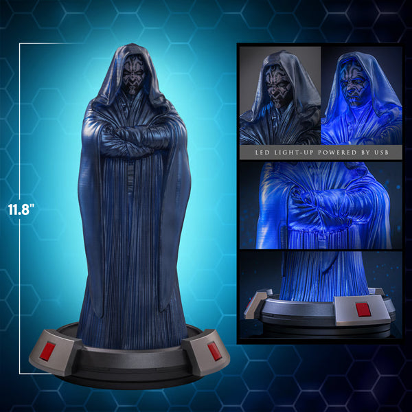 Este coleccionable está especialmente diseñado a partir de la apariencia holográfica de Darth Maul en Star Wars: La Amenaza Fantasma. Presenta un diseño holográfico azul translúcido, una pintura aplicada con maestría y función de iluminación LED alimentada por USB.