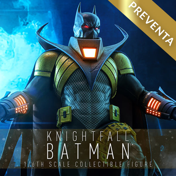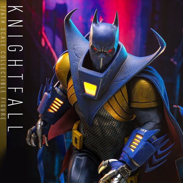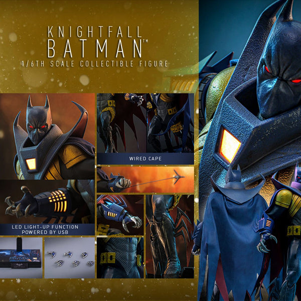 Sideshow and Hot Toys proudly introduce the Knightfall Batman™ Sixth Scale Collectible Figure. The action figure showcases a masked head sculpt with LED light-up function on the eyes, which amplifies the eerie intensity of Batman’s vigilante gaze. His suit is painted in bold gold and blue tones, enriched by armor pieces that display battle-worn weathering. The suit features an LED-lighted large shoulder armor piece, as well as LED-lighted gauntlets, recreating the suit’s intimidating tech. Completing the fierce silhouette is his blue and red wire-embedded cape, while the yellow waist and thigh pouches accentuate the utility look. For dynamic posing and expression of his ferocity, the figure includes six clawed hands, each designed to bring his menacing presence to life. It comes complete with an attachable grappling hook and a stylish figure base to offer dynamic display options.