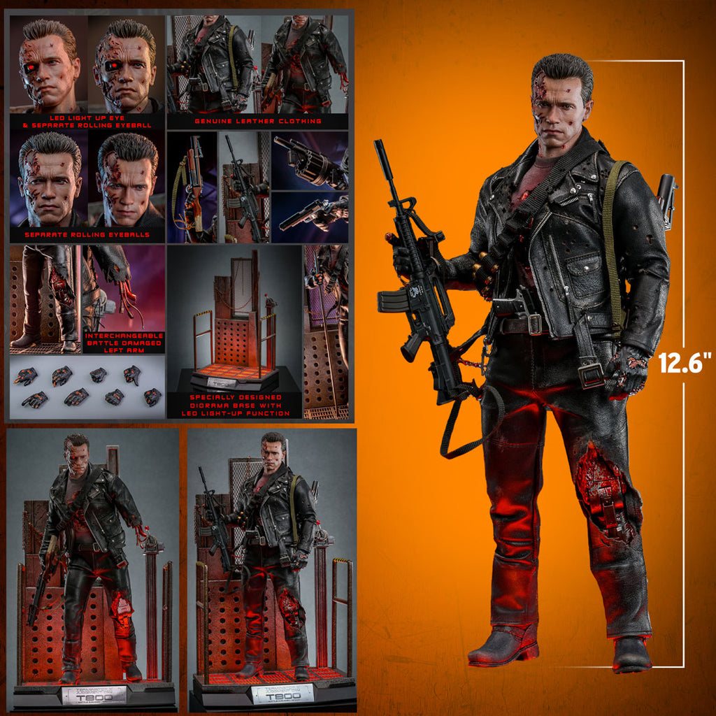 La figura del T-800 a escala 1/6, fielmente recreada con daños de batalla, incluye una cabeza esculpida de nuevo diseño con un ojo móvil independiente, así como una cabeza adicional muy dañada que deja ver el endoesqueleto con un ojo derecho iluminado por LED; un traje meticulosamente confeccionado con chaquetas de cuero genuino (una versión dañada en batalla y otra adicional con la manga izquierda desgarrada), un pantalón también de cuero genuino y una camiseta gris estampada; y armas que incluyen una ametralladora, un rifle, una pistola, un lanzagranadas, un juego de balas y una varilla. Y por último, una base de diorama especialmente diseñada con temática de acería e iluminación LED para recrear la icónica escena final de la batalla entre el T-800 y el T-1000.