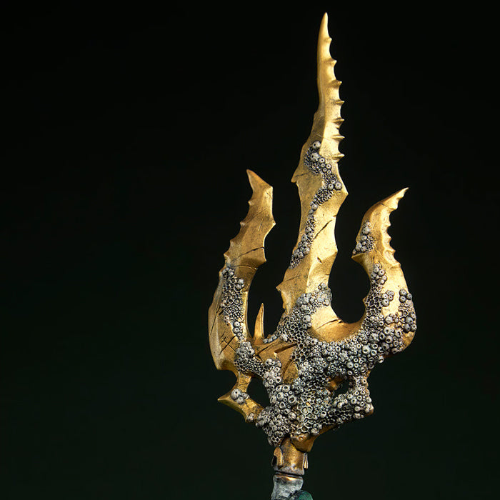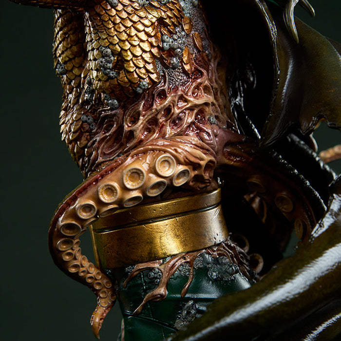Inspirada en la apariencia del personaje en los cómics, la estatua de DC, completamente esculpida, presenta a un inquietante guardián cubierto de crustáceos, escamas de pez y otros componentes de sangre fría. La pintura metálica desgastada de su armadura oxidada evoca un naufragio olvidado en los fríos e implacables barrancos del fondo del océano. Aquaman empuña un tridente dorado desgastado mientras avanza, preparado para la batalla y con todas las cicatrices de su pasado. Un calamar rojo se une a él. Desde las profundidades, y a medida que los tentáculos verdes del héroe se unen a él, el hombre se convierte en mito... en monstruo.