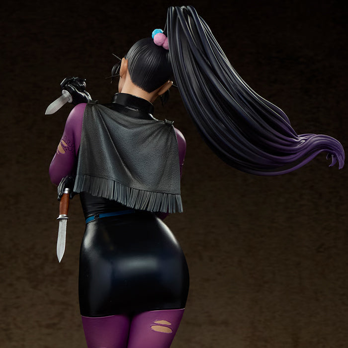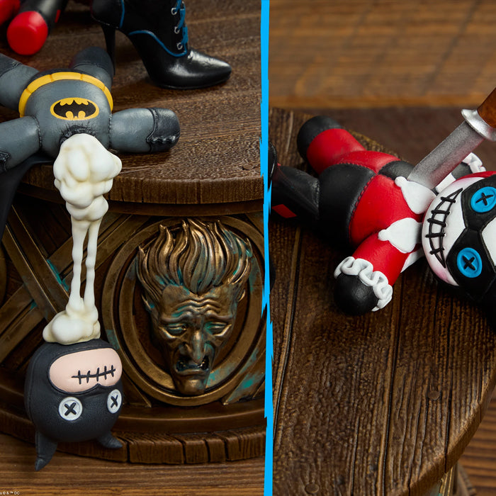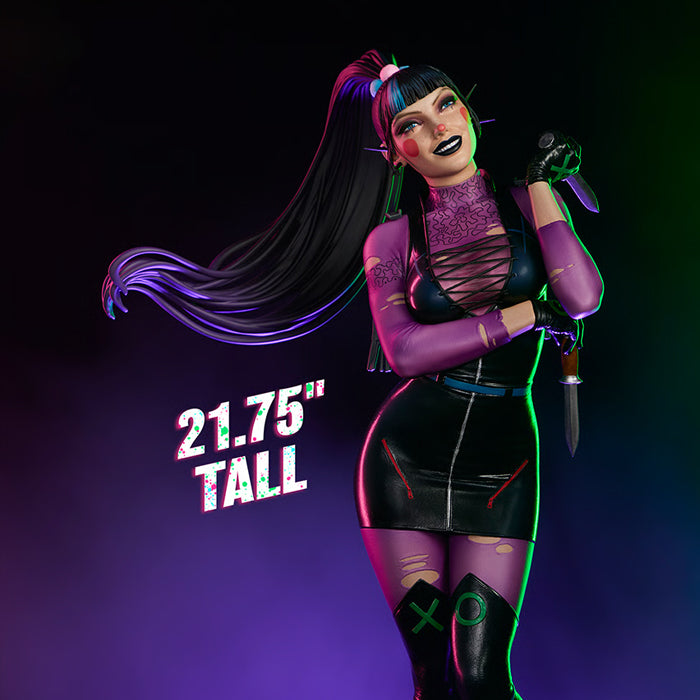 Inspirada en la apariencia del personaje en el arco argumental de La Guerra del Joker, esta figura coleccionable de cómic, esculpida con precisión, representa a Punchline con un body morado rasgado, un vestido negro con corpiño tipo corsé, botas negras hasta la rodilla y una pequeña capa negra. Empuña su arma predilecta en la mano derecha mientras se yergue sobre un pedestal circular que simula una base de madera y latón envejecido. La estatua de DC a escala 1/4 incluye dos rostros: uno neutral y enigmático, y otro astuto, que revela el placer que Punchline obtiene de su condición de supervillana. Cada expresión se complementa con una larga coleta alta con mechones de un azul intenso.